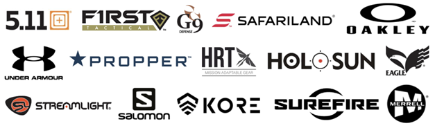 We proudly work with the top names in the industry, including: 5.11 Tactical, First Tactical, Propper, Safariland, Bianchi, Kore Essentials, HRT Tactical, Eagle Industries, ASP, Holosun, Streamlight, SureFire, G9 Defense Ammo, Salomon, Merrell, Oakley, Under Armour, and hundreds more.